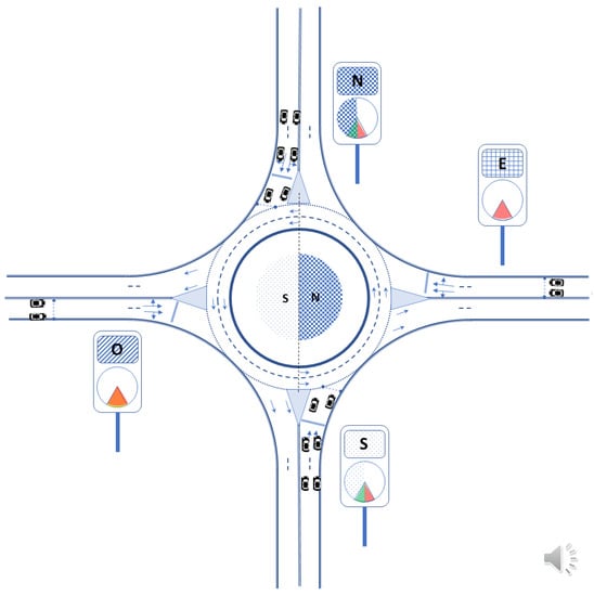 Figure 8 shows the signaling schematically at the instant when the ring and the illuminated panels indicate the immediate beginning of the access priority for the north and south accesses, given that their respective semicircular sectors N and S begin to cross the access associated with their respective sectors. Vehicles at the north and south entrances may, therefore, begin to exceed their stop lines.