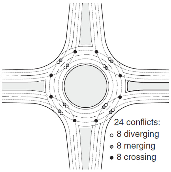 Conflict points in a standard roundabout [5].