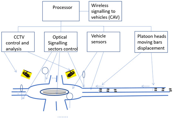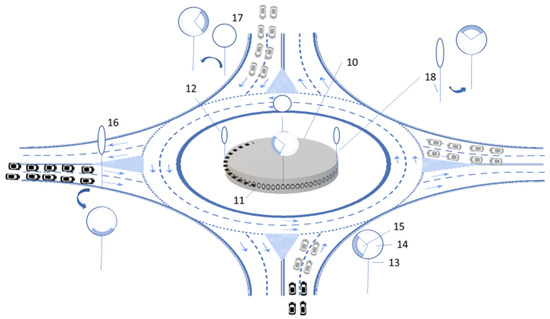 The use of metering signals and stop lines at the roundabout’s access points to create gaps that improve its performance are proven techniques [4,14]. Various roundabout designs are known, including the turbo-roundabouts [15], which seek to reduce the number of conflict points in roundabouts. Regarding roundabout signaling, the design of [16] for conventional vehicles at roundabouts uses a central ring at the roundabout with two operating modes: either it lights up in sequence, so that the lights (like arrows) move in the direction of rotation of vehicles at the roundabout, or flashes to indicate caution.
