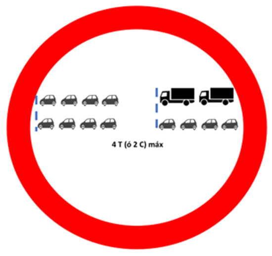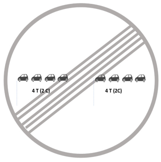 To form the platoons of vehicles of the appropriate size (e.g., from two rows of four vehicles), the dynamic platoon header lines are initially at the beginning of the platoon circulation area delimited by the signals (Figure 6 and Figure 7), and controlled by the central processing unit. This distance between platoon heads is, for the variant described, a distance equivalent to 1.5 times the length of the roundabout’s central circumference (the line separating the two lanes). The maximum number of consecutive vehicles per row of the platoon depends on the dimensions of the roundabout. Drivers are informed in the sign of Figure 6 of the maximum platoon length in the number of consecutive cars (C) and trucks (T), and the minimum but recommended distance to keep from the preceding platoon. The stop lines at the accesses, only used in case of congestion, are located at a distance from the roundabout that is sufficient to reach the speed of the rotating sectors to maintain the smoothness of operation.