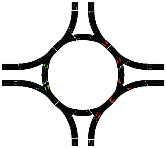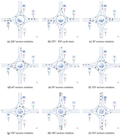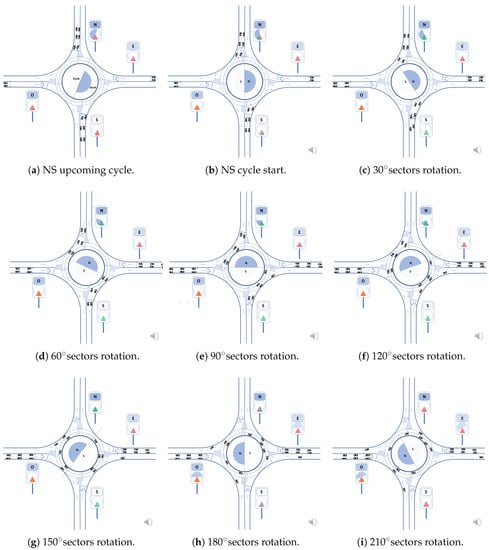 The vehicles of north and south accesses reach the edge of the roundabout and freely circulate during their sector’s duration, having finished their access priority in Figure 8g and thus ceasing to have access to the roundabout. Figure 8i shows the starting time of the priority for the accesses with the east and west sectors’ appearance when the east and west sectors reach the lower sectors of the east and west accesses, in the vertical light panels.