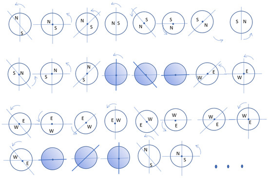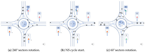 In Figure 9a–g it can be seen how the lower sector in the east and west panels lights up green starting from the left side Figure 9b, coinciding with the passage of the east sector through the lower sector and ending on its right side Figure 9h. In the central circle, the most advanced radius in the direction of rotation of the south and north sectors is then fixed in the west and east directions, respectively, stopping its rotation. However, the most backward radius of the north and south sector continues to rotate. Thus, the amplitude of these sectors begins to decrease. In the space created by this decrease, the east and west sectors appear and grow gradually with the general turn of traffic and to the same extent that the North and south sectors contract. The east and west access vehicles begin to access the roundabout when they have priority, i.e., their priority sector passes in front of their access.