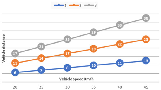 The most critical aspect that impacts roundabout capacity is the distance between vehicles (follow-up headway in seconds or meters). In conventional roundabouts, this distance is significant because the follow-up time ( = 2.7 s) includes the delays involved in human reaction to follow the preceding car when it starts. If we reduce in one second by avoiding stops and speed changes, the corresponding inter-vehicle distance may be reduced. Figure 11 shows typical values for inter-vehicle distances versus time gaps in seconds. In [10], the follow-up headway (time between passing) vehicles in standard roundabouts has been recently reduced to approximately 2.6 s, including the first vehicle’s length, which takes about 0.5 s to pass.