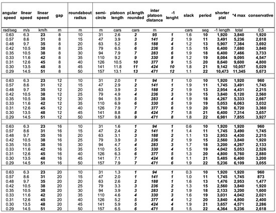 The roundabout rotation periods have been chosen to result in a linear speed in line with a realistic linear arrival speed at accesses depending on their diameter (25 to 45 km/h). Increasing the rotation period reduces the capacity in the same proportion. The three capacity columns are computed as follows: the maximum capacity column (center) is obtained assuming full platoons of spaced vehicles at the distance gap selected (8, 12, 16 or 20 m) with the maximum length allowed physically. However, the left column is more conservative. It assumes that the length of the platoons is one unit less than the maximum possible (if maximum length is equal or greater than 2), to take into account multiple factors preventing platoon optimization, and the right column is the most conservative approach: it assumes that the practical capacity is half of the maximum capacity calculated.