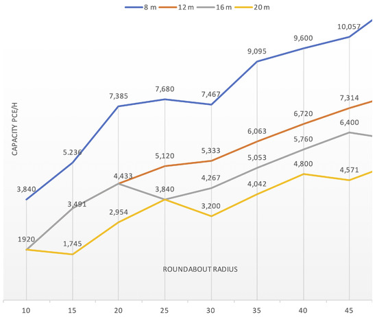 Figure 13 represents the maximum capacities results from the previous table (middle) for different roundabout radius and inter-vehicle distances. The coincidences in capacity values result from the granularity introduced by the fixed platoon (equal in all accesses) when the platoon length is the same for two inter-vehicle distances. The rotation period for the bigger roundabouts is larger, so the capacity is lower than the smaller radius roundabout. The performance steps are significant because an increase of just one vehicle in the length of platoons means 2 × 4 = 8 more vehicles crossing in 1.5 roundabout periods (e.g., 24 s) 1200 pce/h theoretical maximum. In real roundabouts, traffic is not equal in all accesses, and sector duration may be adapted to traffic intensities. These cases are subject to future work.