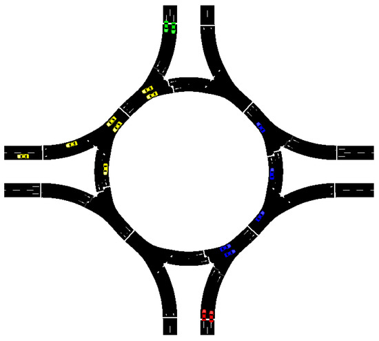 Snapshot of the simulation. The vehicles in the north (green) and south (red) are arriving just after the vehicles from west (blue) and east (yellow) have passed their respective entries to the roundabout.