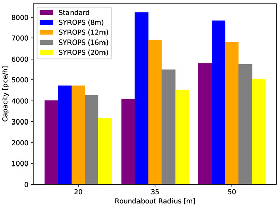 The results of this comparison regarding the number of vehicles that can traverse the roundabout in one hour are shown in Figure 15. The SYROPS mechanism is implemented was SUMO using traffic lights. The values in meters shown between brackets after the SYROPS label correspond to the safety distance between vehicles that is used by SUMO. For the standard roundabouts, a safety distance of 15 m is used. Thus, for SYROPS (16 m) and SYROPS (20 m), the distance between the vehicles is higher than in the standard roundabouts approach. These two correspond to a roundabout controlled with lights but without the benefits of platooning. For these two cases, as expected, the performance decays and is comparable or slightly better than the performance of the standard roundabout. For this simulation, the incoming traffic is assumed to be evenly distributed. Additionally, we can see that our approach’s improvement compared to a standard roundabout is comparably small for small roundabouts and increases drastically for a large roundabout. This behavior is caused by a smaller number of vehicles in small roundabouts, which decreases the number of potential conflicts. Additionally, we can observe that the roundabout capacity generally increases with increasing size of the roundabout due to the increased speed of the vehicles. Thus, the number of vehicles is relatively constant between 35 and 50 m, which differs from our analytical results. This difference is justified by SUMO’s vehicle behavior, which prevents vehicles from entering the roundabout if another vehicle with priority is nearby. We can also observe that the roundabout capacity decreases with increasing inter-vehicle distance, which is expected as fewer vehicles will be driving in a platoon, and thus can traverse the roundabout per cycle.