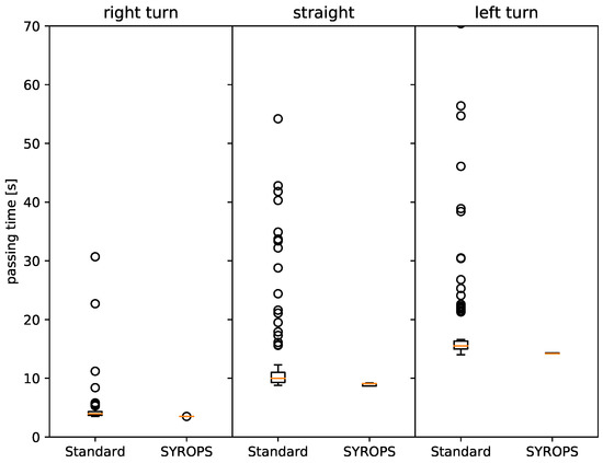 The time a vehicle spends in a roundabout 35 m in diameter is shown in Figure 16. In this figure, we differentiate the different turn types, where a right turn refers to the vehicle taking the first exit, straight to the second and left to the third. We can observe a drastic improvement in vehicle passing time for all of the three turn types. An interesting prospect is that the right turn’s improvement is smaller than for straight and left turns, as the number of potential conflicts is very low, and the path is very short for vehicles making a right turn. Thus, the median time spent in the roundabout is not improved, while only the 75th percentile is improved by . When looking at straight, we also observe an improvement of of the 75th percentile, and a small improvement in the median by , which is caused by the increased number of possible conflicts. SYROPS prevents said conflicts. Thus, the time spent in the roundabout becomes very predictable and has little fluctuation, which is suitable for having a constant and accident-free traffic flow. For the left turn, the improvement is very drastic, as the number of possible conflicts is the highest among all directions. Thus, we can see an improvement of in the median time, and an decrease in the worst case. The overall average time spent of a vehicle in the roundabout independent of the direction is improved by .