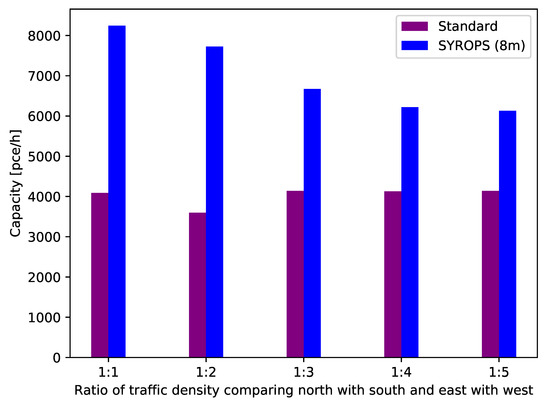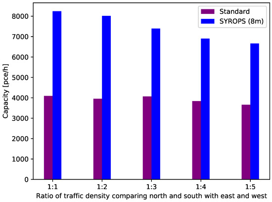In the following, we present comparative SUMO simulation results to show the performance of our approach in these scenarios versus the standard roundabouts (yield type). In Figure 17, we analyze how a unbalance in the opposite traffic flows (e.g., south is higher than north, east is higher than west) affects the capacity performance of our approach compared to standard roundabouts.