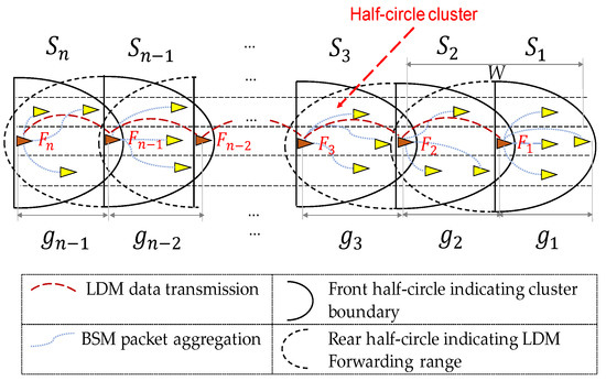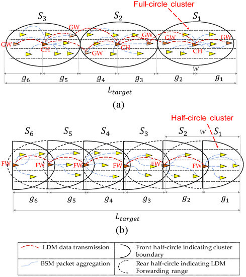 There are two significant benefits of using the half-circle clustering scheme over the full-circle clustering method. Firstly, each FW can support direct communication with neighbor (leading and lagging) FWs. Therefore, each FW can maintain both intra-cluster and inter-cluster links, as shown in Figure 3b. Secondly, the half-circle clustering method allows FWs to transmit a redundant data much less than the full-circle clustering method. In the half-circle clustering scheme, LDM data is propagated only backward, and therefore data overhead is significantly reduced.