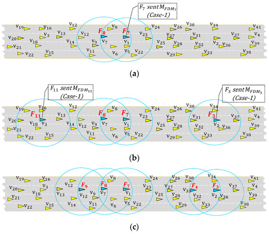 Case 2: (Algorithm 1 line 9–20) The elected forwarders are denoted either by or . Here, the order of forwarders is opposite to traveling direction of vehicles. In other words, denotes the previous forwarder for the leading cluster from the perspective of the current forwarder, while is the next forwarder for the lagging cluster. For example, in Figure 5b, is of , while is of . In Case2, the algorithm elects the lagging forwarder only with respect to its previous forwarder (backward of the vehicle travel direction).
