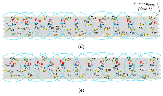 Forwarder election procedures in the proposed method. (a) initial forwarder is elected by Case 1; (b) the forwarders are simultaneously elected by Case 1 and Case 2; (c) the forwarders and are elected by Case 2; (d) the forwarders and are elected by Case 2 while is elected by Case 1; (e) the vehicles on highway road is divided into 12 different clusters.