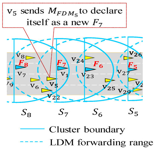 Here, denotes the location of host vehicle at time. Similarly, is the location of (the forwarder of the previous cluster of ) at time . The algorithm elects as the neighbor that has the shortest or the farthest inter-vehicle distance from . The of constantly decrements until it expires. Once of expires, elects itself as a forwarder, and broadcasts to notify all one-hop neighbors. Then, all receivers located in front of ’s wireless range become the member of current cluster, where is self-designated forwarder. For example, in Figure 5a, from (current ) initiates distance-based back-off procedures in the lagging neighbors , , and . From Equation (3), , since the distance from is the farthest from , and closest from . Since decrements to zero before and , declares itself as the next forwarder (an of the current ). This procedure is repeated by acting as a next to elect the next .