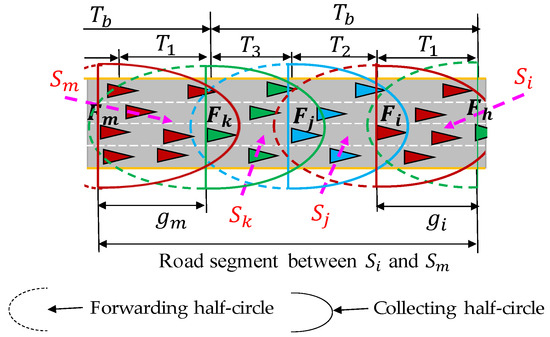 If selected earlier slot than other neighbors, transmits in its slot and then becomes forwarder . On the other hand, if selects later slot, other vehicle would transmit its and become a forwarder. If receives from other vehicle, it dismisses its own transmission scheduled at randomly selected slot. For example, Figure 5a,b,d show examples of initial forwarders elected in this way (, , , and select themselves as , , , and that selected the earliest time slots).