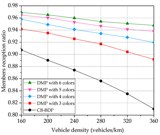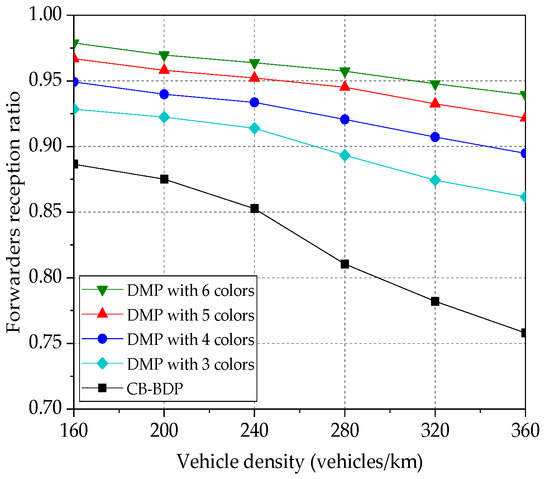 In this experiment, we proportionally extend the beaconing period to accommodate more colors (with each color representing each transmit windows). Therefore, in Figure 11, we also show the impact of increasing number of colors on a reception ratio of the member vehicles. The clusters are assigned with fixed wireless range and they may serve only vehicles. Therefore, when the vehicle density grows, the distance between the clusters with the identical color shrinks. Then, a communication conducted in one cluster may start interfering with the neighboring clusters. In such a case, the members’ reception ratio degrades if the number of available colors is not enough. DMP obtains a higher members’ reception ratio, when the number of colors increases. For example, DMP provides 17% improvement in members reception ratio over CB-BDP, when it utilizes six colors. This experiment also proves that DMP can be applied in crowded city area with many intersections. In an intersection, for example, the set of colors can be divided into multiple disjoint subsets and allocated to individual roads of the intersection to reduce the interference. Figure 12 shows a reception ratio of LDM message for the forwarders (forwarder to forwarder reception ratio).