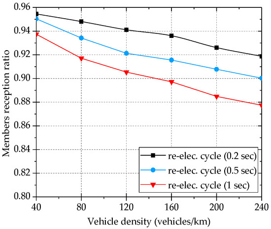 Figure 13 demonstrates the result of the experiment where the members reception ratio is measured for various network density. In this experiment, we change the forwarder re-election cycle time, in which re-election operation is periodically executed by each forwarder. Although a high network density causes reduction in the members reception ratio, a shorter re-election cycle improves the members reception ratio. For a vehicle density of 240 vehicles/km in Figure 13, when a re-election cycle of 1 s is chosen, the members reception ratio is 87.7%. When we shorten the re-election cycle to 0.5 s and 0.2 s, respectively, the members reception ratio increases to 90% and 91.8%.