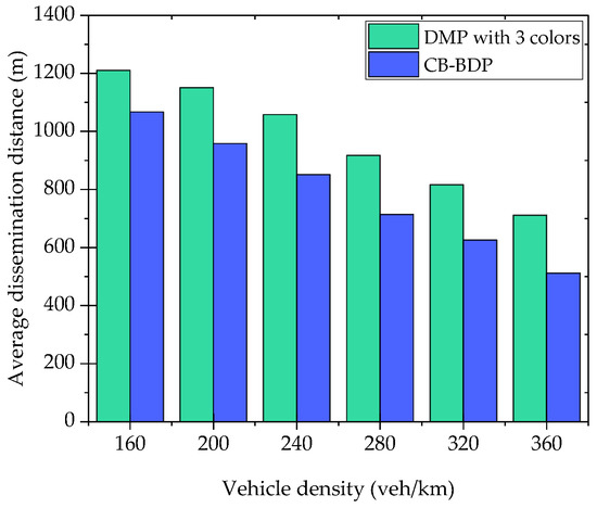 Figure 14 compares the average propagation distance of LDM messages for the two algorithms. Since we constrain the number of member vehicles in each cluster by , the cluster size (inter-forwarder gap) shrinks for the growing vehicle density. Thus, the LDM message dissemination distance decreases gradually as we increase the density. CB-BDP demonstrates a poor dissemination distance of 500 m for than DMP, since it suffers from a higher hidden terminal interference in the inter-cluster communication. For example, for a vehicle density of 360 vehicle/km in Figure 14, CB-BDP disseminates LDM only to 500 m, whereas DMP disseminates LDM up to 711 m (29% improvement).