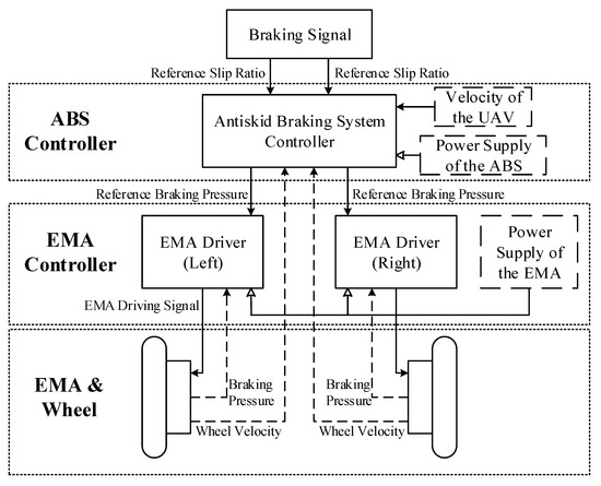 Since the ABS and EMA controllers have been obtained, the complete control structure of the UAV antiskid braking system can be established, as shown in Figure 6.