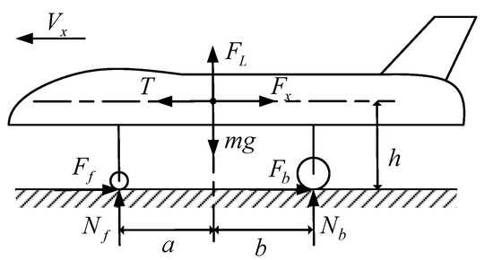 Before establishing the ABS controller, an appropriate dynamic mathematical model of the UAV is necessary. The actual mathematical model of a UAV is highly complicated—the kinetic equations of 6 degrees of freedom (DOF) have been defined in [20], and the interaction between the landing gear and antiskid braking system was clarified in [21]. In fact, a complex UAV mathematical model is not conducive for the design of the slip ratio control strategy. A rational simplified mathematical model of the UAV is the basis of the ABS controller, and the aerodynamic effects on the UAV also need to be considered [22].