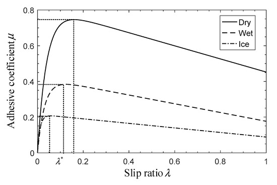 The adhesive coefficient is affected by several factors, such as the slip ratio, the velocity of the UAV and the runway conditions. Existing models of the adhesive coefficient are usually obtained by fitting the experimental data, and this coefficient is typically denoted as a single variable function of [29,30]. For example, the widely used Burckhardt model is described as , and the corresponding model under three different runway conditions is shown in Figure 3.
