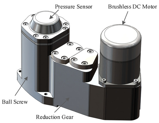 The EMA is the actuator of the UAV antiskid braking system, and it is composed of a pressure sensor, a brushless DC motor (BLDCM), a reduction gear and a ball screw [31]. The ball screw is driven by the BLDCM through a set of reduction gears, and the braking pressure is generated by the ball screw squeezing the brake disc. The structure of the EMA is shown in Figure 4.