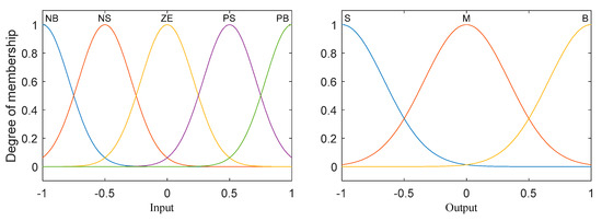 The basic input domain of the fuzzy subset is , where the elements respectively represent positive big, positive small, zero, negative small, and negative big. The output domain of the fuzzy subset is , where the elements respectively represent big, medium and small. Considering the transitivity among the linguistic variables, the commonly used Gaussian function is adopted as the membership function of the inputs and outputs, as shown in Figure 5.