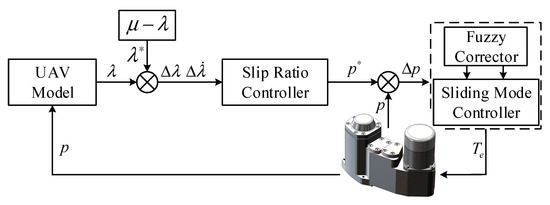 The dynamic performance of the UAV braking system depends on not only the actuating mechanism but also the advanced braking control strategy. Typically, the use of sensors is very common in autonomous robotics systems (e.g., mobile robots [11] and inspection robotic arms [12]) for purposes such as collision avoidance and testing, and therefore equipping the UAV with sensors is mandatory as a kind of aerial robot. By using various sensors, such as the acceleration sensor, the velocity and acceleration of the UAV can be obtained, which makes it easier to apply an advanced antiskid control strategy in the UAV braking system. Certain control systems use the slip velocity to control the braking pressure of the aircraft. However, the limitations of poor efficiency and unsteadiness limit the control effects of such control systems. With continued innovations in control theory, the slip ratio control has been regarded as a better antiskid control strategy. The main concept of the slip ratio control involves attempting to maintain the actual slip ratio at its optimal value, which results in the maximum adhesive coefficient between the wheel and runway. According to the relationship between the slip ratio and the adhesive coefficient, if the actual slip ratio considerably exceeds the optimal value, the wheel may skid out of control, and this will reduce the lateral stability of the UAV. Therefore, it is important to maintain the stability of the slip ratio.