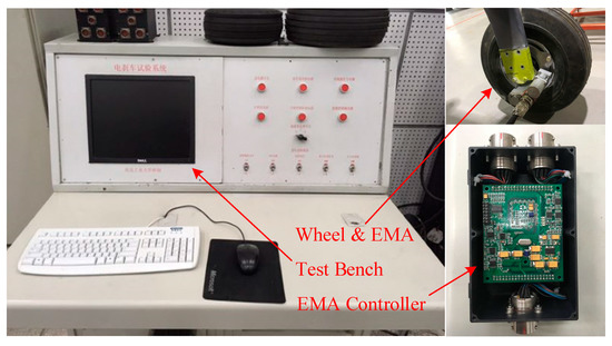 This section describes the validation of the designed ABS controller and EMA controller via experiments. As it is difficult to test the ABS controller in an actual UAV, a hardware in loop (HIL) test bench is built, which consists of two parts: the software and hardware [35]. The software part includes the UAV model and the upper computer, while the hardware part includes the ABS controller, EMA controller, EMA, and the wheel. The UAV model is built by using Simulink and downloaded to the simulation board to realize the simulation of the braking process, and then the velocity signal from the UAV model is transmitted to the ABS controller. After receiving the velocity signal, the ABS controller calculates the real-time slip ratio and outputs the reference braking pressure signal. Subsequently, the EMA controller receives the reference pressure signal and drives the EMA to realize the corresponding braking pressure. The HIL test bench of the electric braking system is shown in Figure 7. It should be noted that the generation of this paper is based on an actual engineering project, in which the unit of the braking pressure is kg, and so the unit of the braking pressure in this paper is the same.