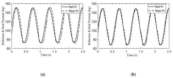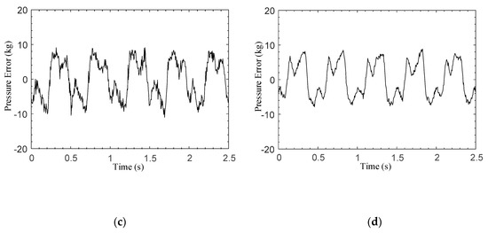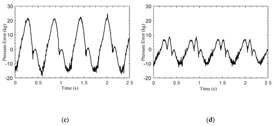 The frequency and amplitude range of the reference pressure signal are 2 Hz and 70–150 kg. The reference pressure and actual pressure of the two control methods are shown in Figure 8a,b, and the pressure errors are shown in Figure 8c,d. It can be seen from Figure 8a,b that the proposed control algorithm demonstrates a better tracking accuracy and smaller phase delays, which are the advantages of the fast convergence of the sliding mode characteristics. The pressure error comparison shown in Figure 8c,d indicates that the sliding mode controller makes the controller more responsive to large ranges of braking pressure, which leads to a smaller tracking error than that achieved with the traditional control method.