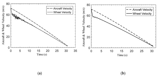 When a UAV lands on the runway, the braking pressure, , is applied to the back wheels, and the longitudinal velocity of the UAV is larger than the velocity of the back wheels [28]. Then the slip ratio, , can be defined as