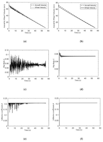 Slip ratio control performance of the ABS controller under dry runway conditions. (a) Aircraft velocity and wheel velocity in PID control; (b) aircraft velocity and wheel velocity in the proposed control method; (c) slip ratio in PID control; (d) slip ratio in the proposed control method; (e) adhesive coefficient between wheel and runway in PID control; (f) adhesive coefficient between wheel and runway in the proposed control method.