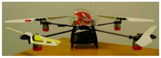 The aerial vehicle on which this work is based is a Draganflyer IV, which has the configuration of four coplanar rotors (quadrotor), as shown in Figure 1. The movement of the quadrotor originates from the speed changes of the rotors. Each rotor consists of a direct electric current motor, a gear mechanism, and a blade rotor. To achieve movement on an axis, a speed difference must be created in the rotors corresponding to that axis. The yaw movement is obtained from the difference in torque between each pair of rotors—that is, it accelerates the two rotors clockwise while decelerating the rotors counterclockwise, and vice versa.