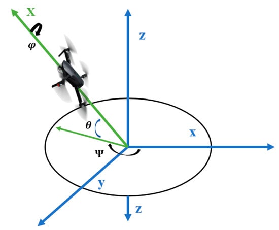 The navigation angles, known in mathematics as Tait‒Bryan angles, are a set of three angles that describe the orientation of a rigid body—in this case, the drone—with reference to a fixed system. We considered two vector sets of a right-handed trihedron that belong to a fixed reference system and a body . The body initially allows rotation about the axis through angle ; the other axes, and , are carried along with the body, keeping their orthogonality. Now the drone rotates around axis about angle . As before, the two axes and are carried along with the body. Finally, the drone rotates about axis through angle such that axes and are carried along with the body. In each rotation, the other two axes are carried along with the body, so that the set of axes around which the rotations occur () are not orthogonal. However, the orientation of the drone can now be described using the Tait‒Bryan angle set .
