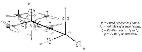 If the vehicle is considered as a rigid solid, the system has six degrees of freedom: three of them define the position of a reference point in the body (the center of mass), and the other three define the orientation of the body, so that, to obtain the model, the quadrotor is supposed to be a rigid body in space, subject to a main force and three moments, which together represent the control inputs of the system. This work will use the Tait‒Bryan navigation angles (Figure 2) to describe the rotation of the system in three-dimensional space.