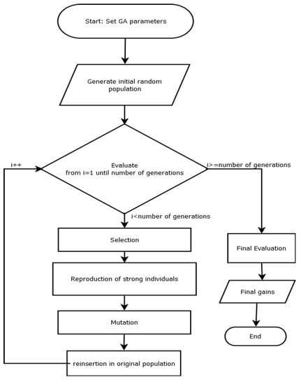 Genetic algorithms have been used to tune the best solution in different control models, from the classic PID control and in fields as diverse as industrial processes and finite element analysis thanks to its versatility and adaptability. Genetic algorithms are based on stochastic optimization techniques that emulate biological evolution and its genetic‒molecular basis, inspired by Charles Darwin’s theory of evolution whereby the fittest prevails. It starts with a randomly generated population and evaluates the objective function with these values, organized in the form of vectors. Those that generate a greater margin of error are discarded; in the next generation, new values are proposed as a combination of those that obtain better results and random values within a predetermined range, emulating the mechanisms of reproduction, crossing, mutation, and so on for a certain number of generations or until the values of the gains obtain results within the values established as acceptable [40].