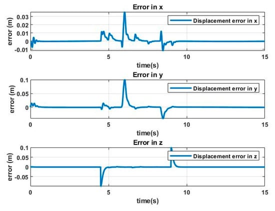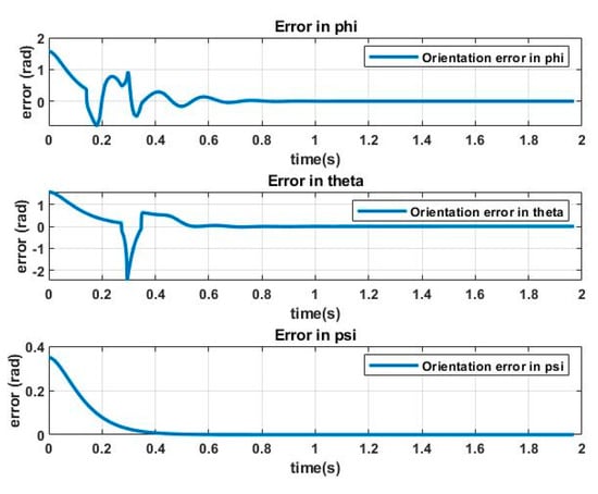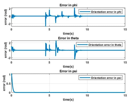 Finally, the errors in position and orientation, respectively, are shown in Figure 18 and Figure 19. Note the effect of the disturbance and the correction of the controller when disturbance disappears.