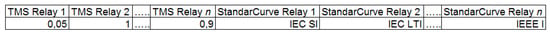 Equation (9) represents the selection of the IEC/IEEE standard characteristic curve. The curve setting of a relay provides information regarding the type of characteristic curve to be followed by that particular relay. In this case, is the select standard characteristic curve of the primary relay i. In this Equation, represents the set of standard curves that are available in the relay.