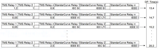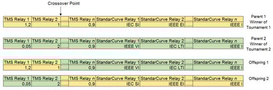 The starting point of a GA is a set of candidate solutions or population. Every candidate solution (or individual) is represented by a vector that contains the proposed values of the decision variables. In this case, each individual is represented with a vector that indicates the settings of and for each relay; therefore, the length of a candidate solution is twice the number of relays in the network. The initial population is randomly generated while taking the limits of the decision variables into account. Figure 1 depicts an example of a candidate solution.