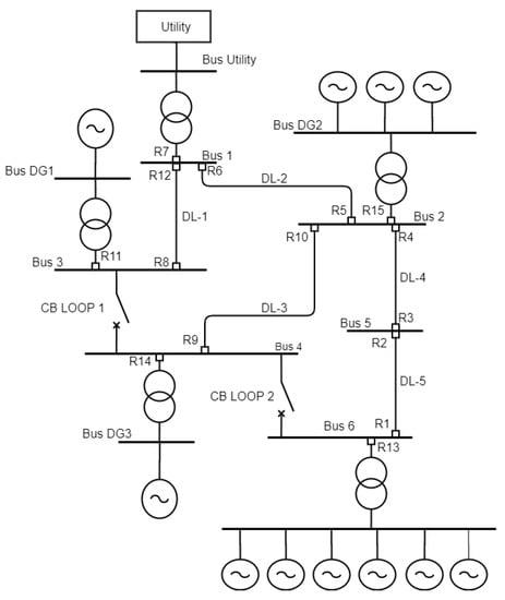 The protection coordination problem ine of these challenges. DG changed the traditional configuration of unidirectional power flows in DNs where there is only a single generation bus. With the presence of DG, there are multiple generation buses that produce bidirectional power flows and variable short circuit levels []. In general terms, new protection systems must guarantee the stability of the protection scheme not only under intermittent DG units and loads, but also under the possibility of switching between grid-connected and islanded modes [,].