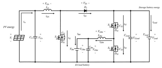 Figure 3 illustrates the proposed three-port non-isolated step-up/step-down bidirectional dc/dc converter for PV ES charging stations. The converter topology comprises a unidirectional boost converter combined with an improved bidirectional buck/boost converter. The unidirectional boost converter is used to step up the PV module output to the ES load bus. The bidirectional buck/boost converter serves as the interface between the storage battery and ES load bus. If the energy of the ES load bus is sufficient, it is stepped down to charge the storage battery. However, if the energy of the ES load bus is insufficient, the storage battery output is stepped up to charge the ES load battery. The auxiliary inductance LBat at the port of the storage battery can change the output voltage of the ES load bus and provide a continuous current to charge the storage battery. The proposed topology focuses on combining PV energy, ES load battery, and storage battery energy; it comprises three switches (S1–S3), a Schottky diode (D1), two inductors (LIn and LBat), and three capacitors (CIn, CLoad, and CBat).