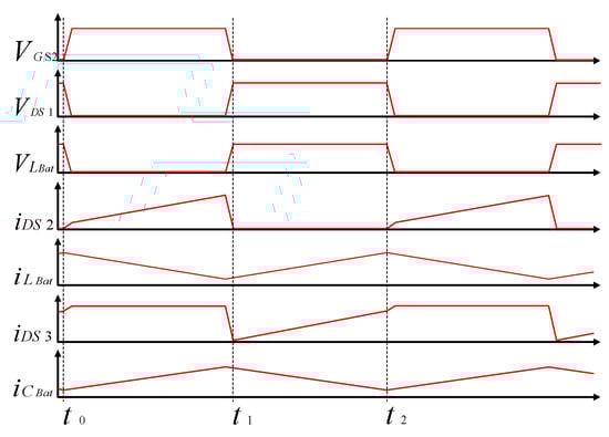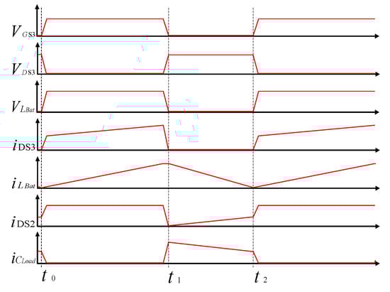 When t = t1, S1 and S3 are continuously turned off and S2 and D1 are turned off. Figure 7b displays the current flow direction. In this mode, the body diode of the switch S3 is turned on, and the capacitor CBat and inductor LBat release energy. The capacitor CBat and inductor LBat provide the energy at the output terminal of the energy storage battery.