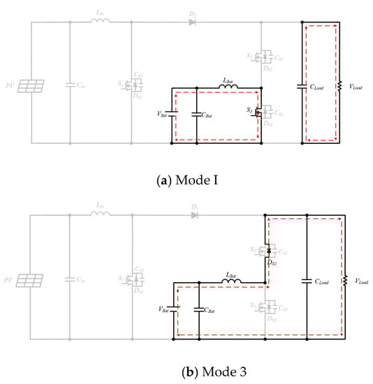 When t = t0, S1 is turned on; S2, S3, and S4 are turned off; and D1 is turned off. Figure 5a presents the current flow direction. In this mode, the PV voltage provides energy for storage in the inductor LIn. At this time, the ES load is provided by CLoad.