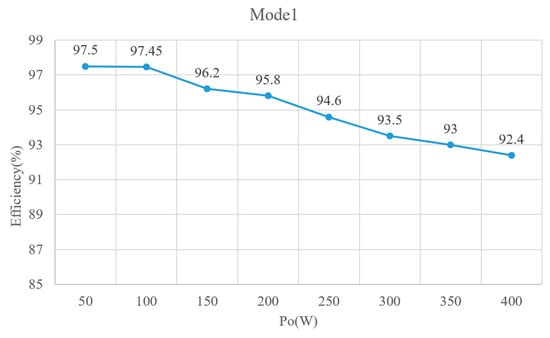 Figure 10, Figure 11 and Figure 12 illustrate the efficiency curves obtained for the three operating modes of the proposed converter. As presented in Figure 10, in Mode 1, the efficiency was observed to be 97.45% under light-load operation (100 W), 95.8% under half-load operation (200 W), and 92.4% under full-load operation (400 W). The highest efficiency attained was 97.5% when the output power was 50 W. As displayed in Figure 11, in Mode 2, the highest efficiency was 92% under full-load operation (60 W), and the efficiency was observed to be 89.7% under half-load operation (30 W). Furthermore, in Mode 3, the efficiency levels were determined to be 97.7%, 97.4%, and 96.6% under light-load (29 W), half-load (60 W), and full-load (120 W) operation, respectively (Figure 12).