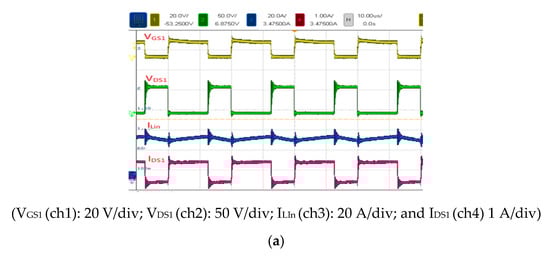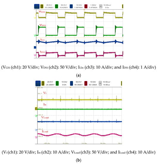 Figure 15 shows the voltage and current waveforms measured in Mode 1 at 400 W (full load). The duty cycle, input voltage, output voltage, input current, and output current of S1 were 57.8%, 24 V, 58 V, 18.4 A, and 6.9 A, respectively. The voltage stress of S1 was 90 V, and the input current of LIn was 18.4 A (Figure 15a). Figure 15b shows the voltage and current waveforms of battery and output load operated under full load.