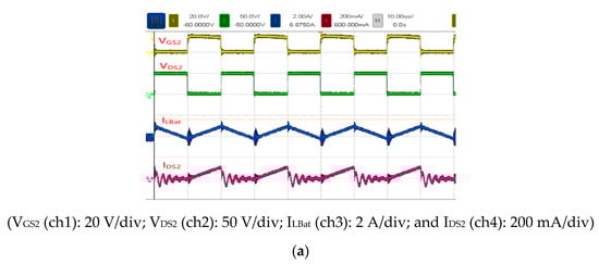 Figure 16 displays the voltage and current waveforms measured in Mode 2 at 14 W (light load) for IDS2 and S2. The duty cycle, input voltage, output voltage, input current, and output current of S2 were 41%, 58 V, 29.1 V, 0.3 A, and 0.5 A, respectively. The voltage stress of S2 was 50 V, and the battery inductance LBat current was 0.5 A.