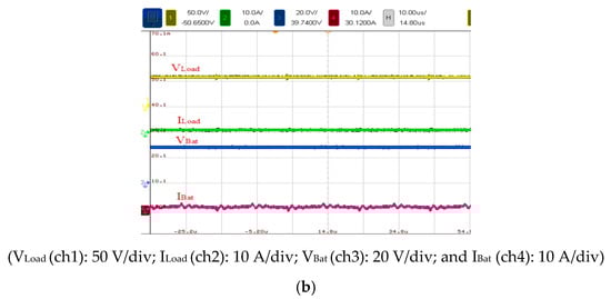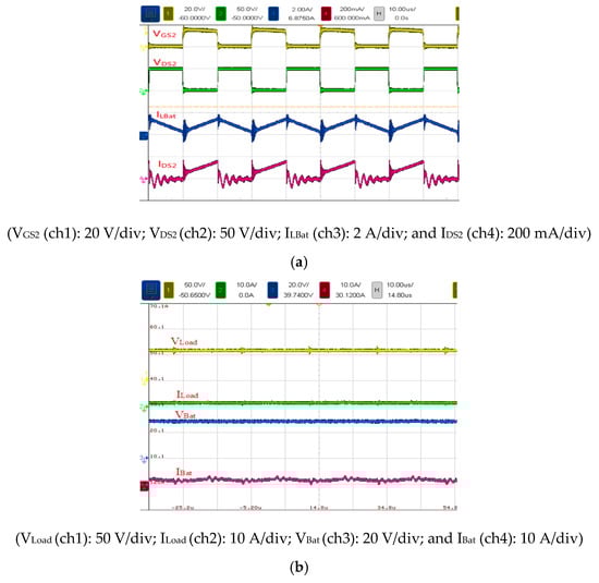 Figure 18 presents the voltage and current waveforms measured in Mode 2 at 60 W (full load). The duty cycle, input voltage, output voltage, input current, and output current of S2 were 47.3%, 58 V, 29.1 V, 1.1 A, and 1.9 A, respectively. Moreover, the voltage stress of S2 was 50 V, and the battery inductance LBat current was 1.9 A (Figure 18a). Figure 18b shows the voltage and current waveforms of battery and output load operated under full load.
