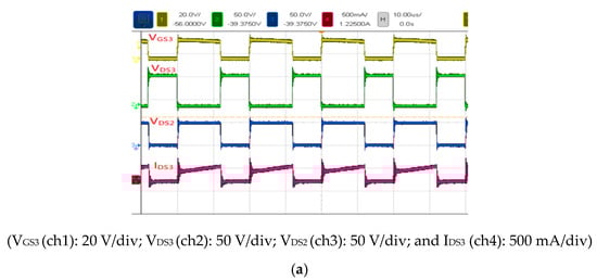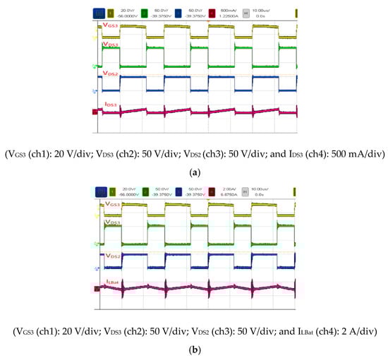 Figure 19 presents the voltage and current waveforms measured in Mode 3 at 30 W (light load). The duty cycle, input voltage, output voltage, input current, and output current of S3 were 56.8%, 24 V, 59 V, 1.26 A, and 0.5 A, respectively (Figure 19a). The voltage stress of S3 was 90 V, and the voltage stress of S2 was 50 V; the current waveform of IDS3 is also displayed in the figure. Figure 19b shows the voltage stress of S3 to be 90 V and the voltage stress of S2 to be 50 V; the current waveform of battery inductance LBat is also displayed in the figure.