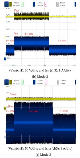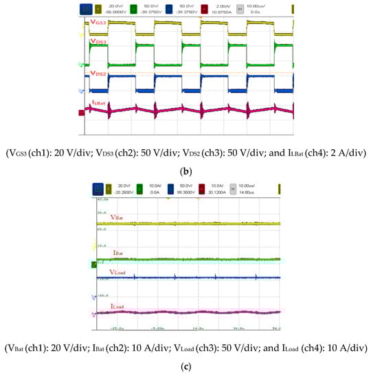 Figure 20 shows the voltage and current waveforms measured in Mode 3 at 60 W (half load). The duty cycle, input voltage, output voltage, input current, and output current of S2 were 58%, 24 V, 59 V, 2.5 A, and 1 A, respectively (Figure 20a). The voltage stress levels of S3 and S2 were 90 and 50 V, respectively (Figure 20b). The control waveform of S3 and current waveform of the battery inductance LBat are presented in the figures. Figure 20c shows the voltage and current waveforms of battery and output load operated under half load.