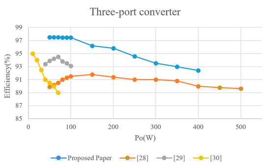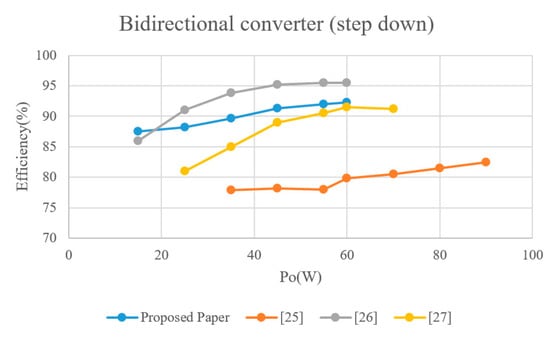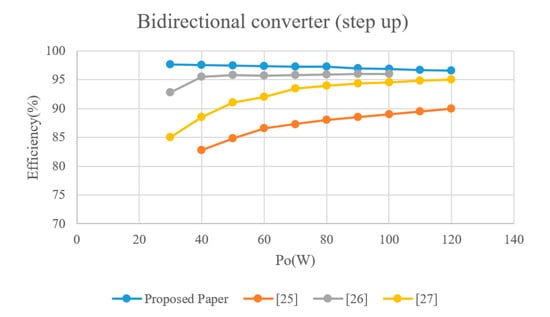 Figure 24 illustrates an efficiency comparison between the proposed converter and those in [25,26,27] under step-up operation. The proposed converter is shown to exhibit the highest efficiency.