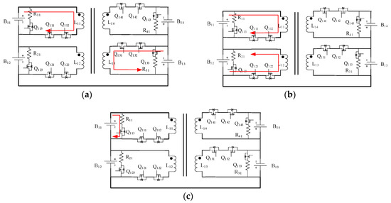 Figure 3c. At this time, the on-resistance of the MOSFET is ignored, and the current can be calculated according to (4). The passive equalization of other battery cells is the same as the above process. Eventually, the excess energy is dissipated in the form of heat: